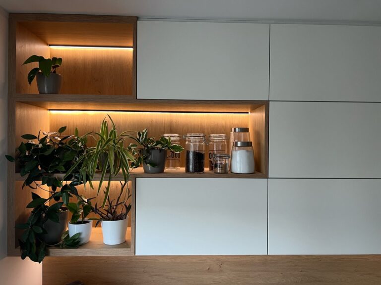 Oprócz kuchni na wymiar oferujemy także bogatą gamę mebli wykonywanych na zamówienie – od zabudów wnękowych i szaf przesuwnych, po garderoby oraz meble łazienkowe.
